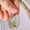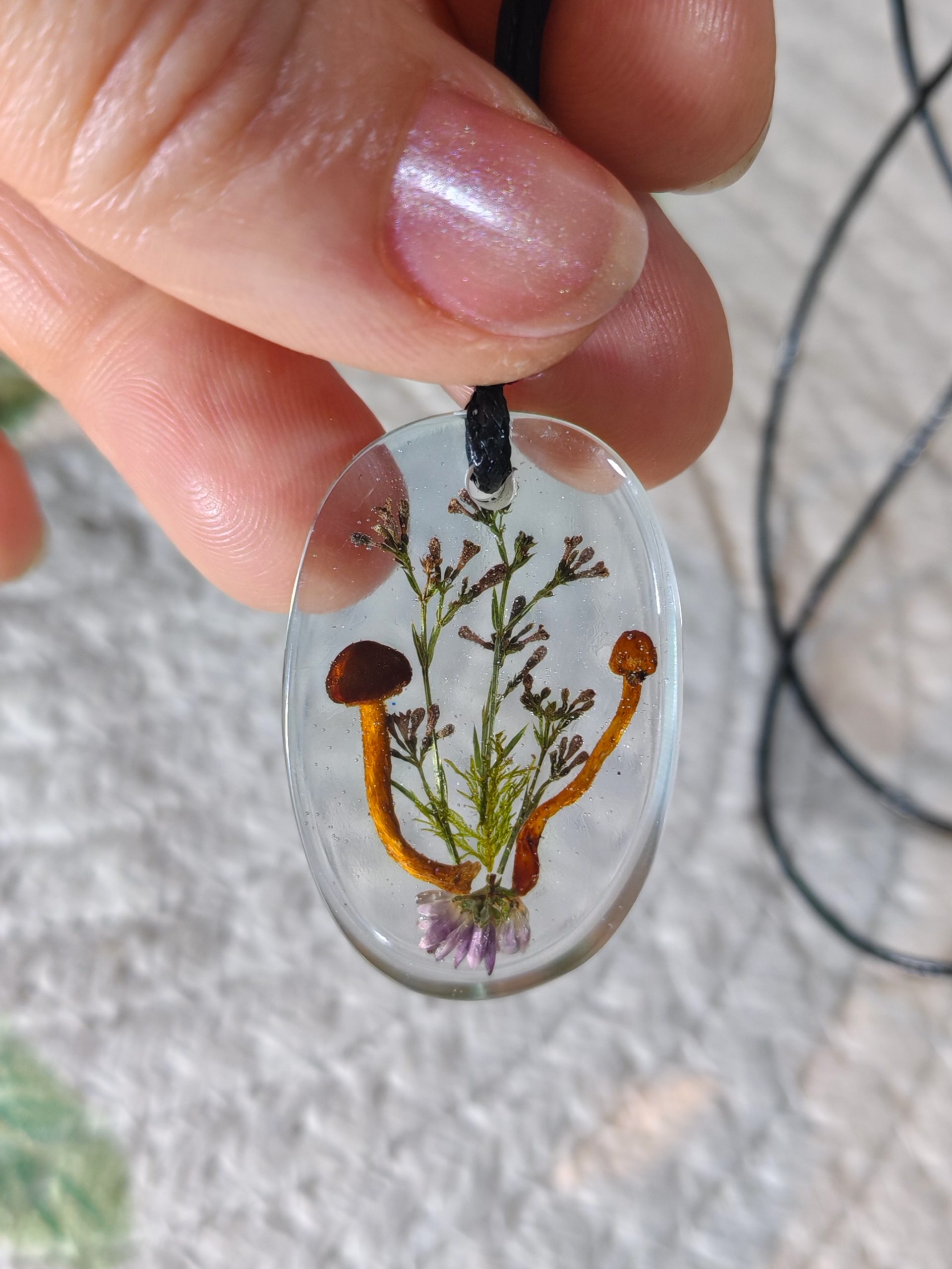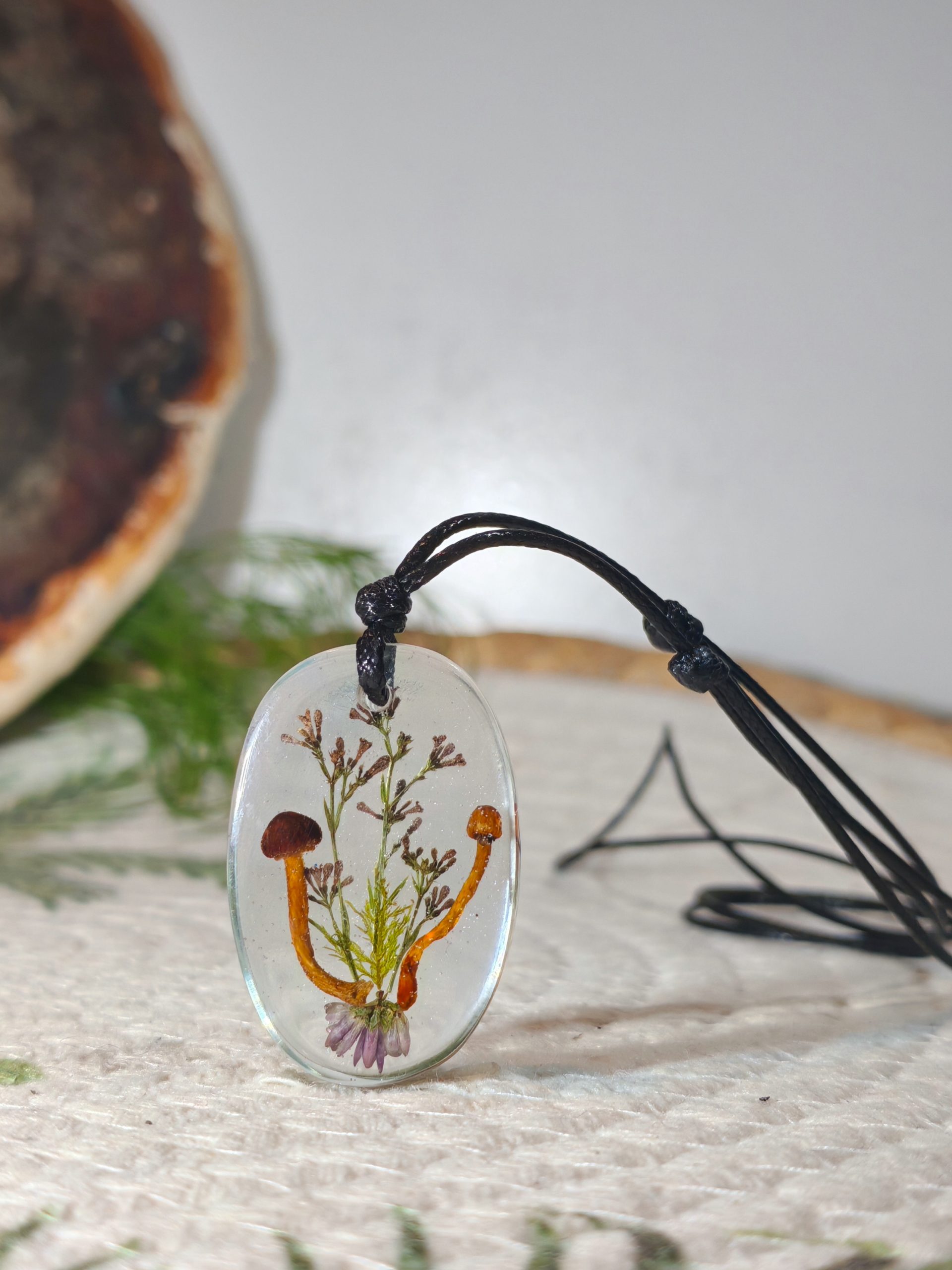 Čudovit obesek iz epoksi smole v katerem so ujete gobice in nekaj različnih rastlinic.