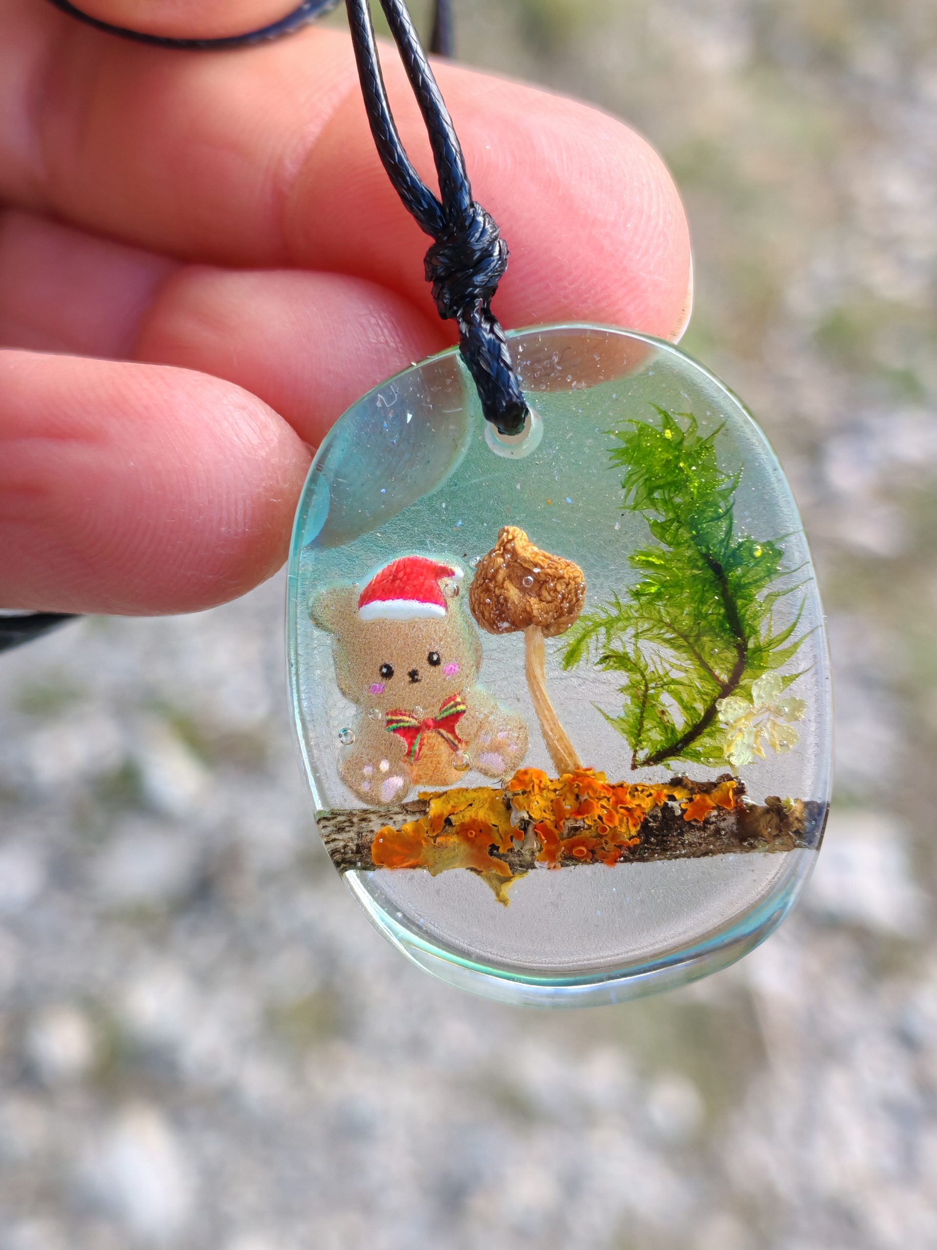Obesek iz epoksi smole v katerem je ujeto božično vzdušje:  gobice zraven katere sedi božični medvedek na vejici z lišaji, cvetek bezga, mah in v ozadju se rahlo lesketajo srebrne bleščice.