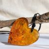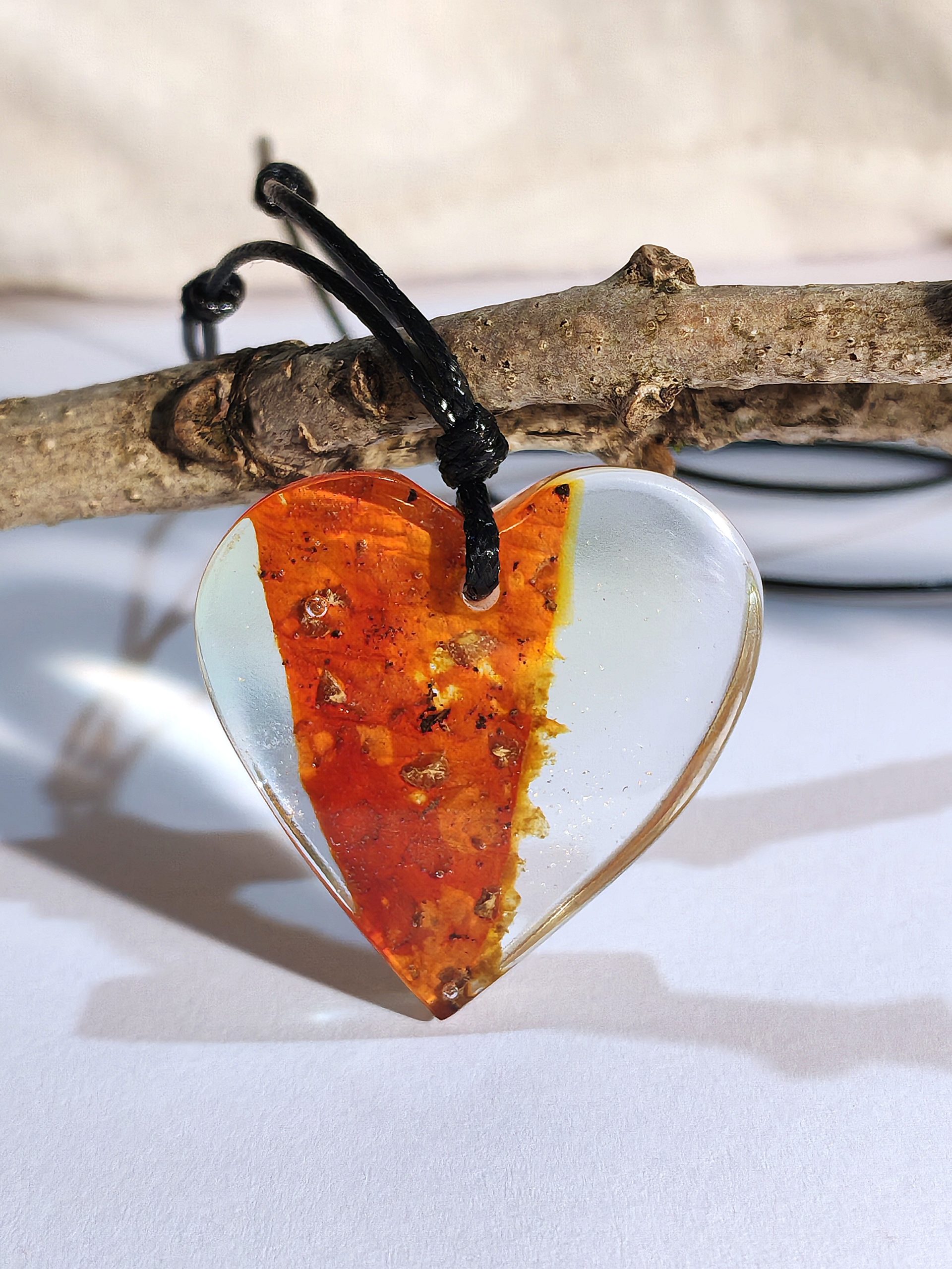 Obesek v obliki srčka v katerem je v ozadju ujet zgornji sloj klobuka rdeče mušnice. V obarvani smoli pa se rahlo bleščijo srebrne bleščice.