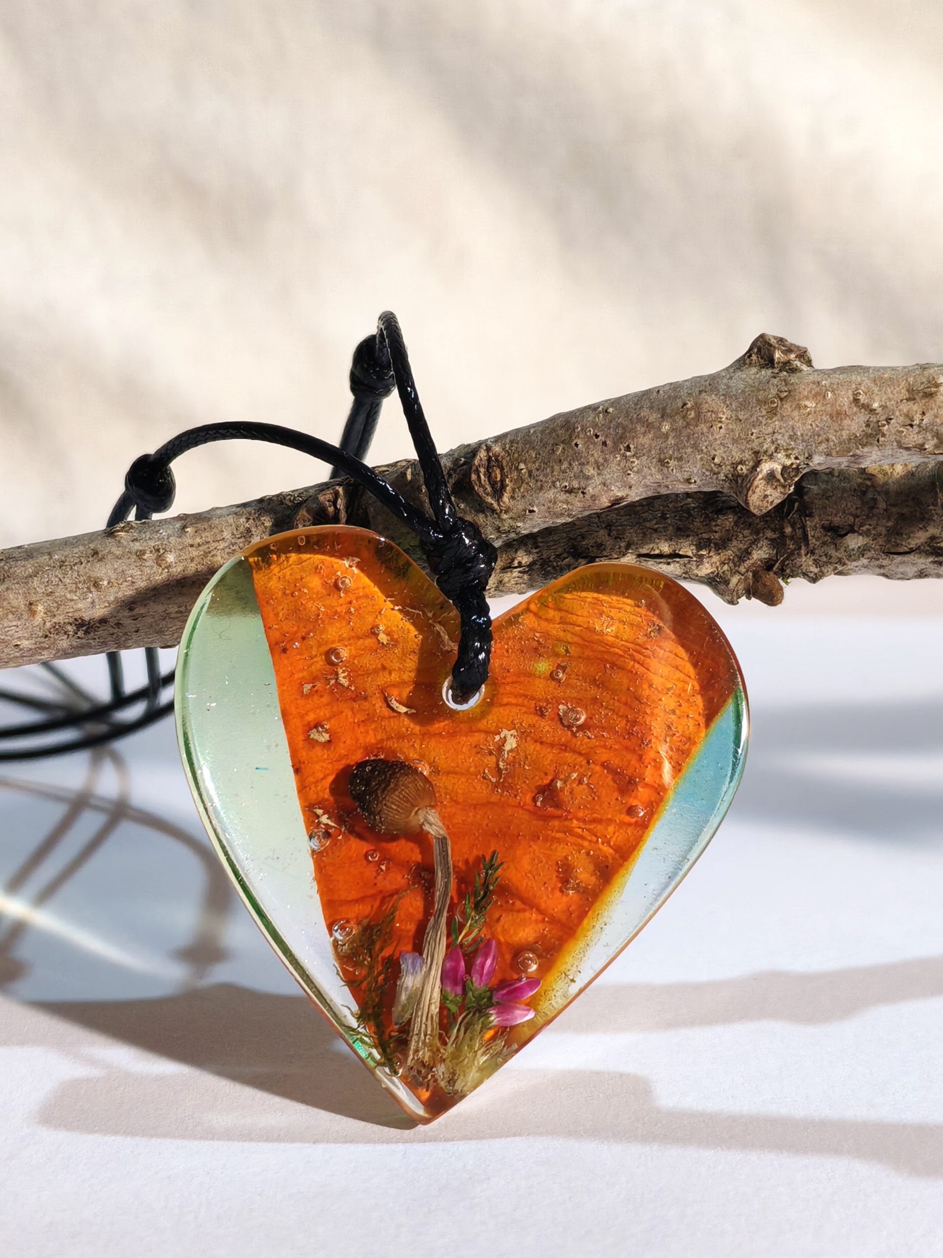 Obesek v obliki srčka v katerem je v ozadju ujet zgornji sloj klobuka rdeče mušnice, spredaj pa je šopek rastlinic in gobica. V modrikasto obarvani smoli pa se rahlo bleščijo srebrne bleščice.